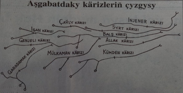 “Suw munuň özi durmuşdyr” diýen hakykata uýan türkmen halkymyz suwuň gadyryny bilip, ony mukaddes hasaplapdyr. Ekerançylyk, maldarçylyk ýa-da agyz suwy üçin peýdalanylýan suwuň sähelçe ýetmezçilik eden ýerinde bolsa çykalga tapmagy başarypdylar. Munuň üçin kärizler, guýular ýaly gadymy suwaryş desglaryny ulanypdyrlar. Şeýle desgalar öňki döwürlerde Türkmenistanyň ähli ýerinde bolupdyr. Žurnalist Seýitguly Mämmetnurow Baş arhiw uprawleniýesiniň başlygynyň orunbasary Baýrammämet Goýunlyýewden Aşgabadyň daş-töweregindäki emeli suwaryş desgalarynyň taryhy barada gürrüň bermegini haýyş etdi. Kärizler emeli ýerasty suw desgalarynyň aýratyn görnüşidir. Olar gadymy Gündogar medeniýetiniň bölegi bolup, ýerasty suwlaryny toplamaga hyzmat edýär hem-de ýerleri suwlulandyrmak maksady bilen aýratyn-da, agyz suwuna bolan islegi kanagatlandyrmak üçin, ony öz akymyna ýeriň ýüzüne çykarmakdyr. Guýularyň, ýap ötükleriniň bu ulgamyny türkmenler käriz diýip atlandyrýarlar. Kärizler emeli ýerasty ötük bolup, olar degişli berkitmeler bilen gurulýar. Kärizler ýeriň suwly gatlaklaryna çenli ötükleri gazmak arkaly ýeriň ýüzünden 100 metre çenli we şondan soň hem köp çuňlukda ýerleşýär. Kärizleriň bir bölegi suwly gatlaklarda ýerleşip, ol käriziň suw ýygnaýjy bölegi diýlip atlandyrylýar. Kärizler diwarlarynyň üsti bilen suwly gatlaklardan geçýän ýerasty suwlary özünde toplaýar. Geçýän suw köp ýa-da az suw geçirýän gatlagyň ýokary ýapgytlygy boýunça belli bir eňňit bilen edilen käriziň jary bilen käriziň boş bölegi diýlip atlandyrylýan ikinji bölegine baryp düşýär, bu suw ýeriň üstüne çykarmak üçin niýetlenendir. Käriziň boş böleginden geçen suwuň bir bölegi ýitýär, suwy geçiriji zatlar bilen süzülýär we şeýlelikde, käriziň suw toplanýan böleginde ýygnanan suwuň doly möçberi ýeriň üstüne çykyp bilmeýär. Käriziň gurlanda bu guýular kärizlere ýygnanýan zatlary almak üçin hyzmat edýär. Türkmenler kärizleri gurmakda gurluşyk tehnikasynyň käbir kadalaryny, daşy, agajy (arçany – onuň ýakymly ysy bolup, suwda gowy saklanýar. Özi-de Aşgabadyň golaýyndaky Köpetdagyň eteklerinde ösýär) hem-de käriziň boş bölegini berkitmek üçin küýzegärçilik önümini ulanypdyrlar. • Käriziler Türkmenistanda haýsy wagtdan bäri we nähili ulanylypdyr? Türkmenistanyň Merkezi döwlet arhiwiniň wagtyň geçmegi bilen saralan dokumentleriniň şaýatlyk edişi ýaly, kärizleri gurmak we olary peýdalanmak hakyndaky maglumatlar 1800-nji ýyla degişlidir. Elbetde, kärizleriň köpüsini XIX asyrda-da gurup başlapdyrlar. Kärizleriň Aşgabat topary günorta-günbatardan demirgazyk-gündogara çekilip, Aşgabadyň 2-3 kilometr günortasynda ýerleşipdir. Bu dzülük Köpetdagyň günorta-günbatar baýyrlyklary bilen çäklenendir. Kärizleriň Aşgabat topary iki bölege bölünýär. Birinji bölege esasy guýulary Köpetdagyň geriş belentliklerinden ýokarda ýerleşen kärizler girýär. Ikinji bölegine bolsa esasy guýulary ýeriň ýapgytlaryndan 3-4 kilometr pesde ýerleşen kärizler girýär. “Balyş” gadymy kärizleriň biridir. Ol 1870-nji ýylda gurlup, günorta-günbatardan demirgazyk-gündogara uzalyp gidýär. 4534,5 metr uzalyp gidýän, 8 guýusy bolan bu käriziň goşmaça şahalary bilen, käriziň uzynlygy 4897 metr bolup, guýularynyň umumy sany 160-dyr. Guýularyň arasyndaky uzaklyk ortaça 3031 metre ýetýär guýularyň çuňlugy ortaça 20-22 metre deňdir. “Syrt” kärizi öz başlangyjyny Garadamak obasynyň günorta-günbataryndan alyp gaýdaýr we günorta-günbatardan demirgazyk-gündogra tarap ugur alýar, onuň 106 guýusy bolup, uzynlygy 3751 metrdir. Guýularynyň aralygyndaky ortaça uzaklyk 41-46 metrdir. “Garadamak” kärizi bolsa günorta-günbatardan demirgazyk-günbatara tarap uzalýar, ýagny Köpetdagyň gerişlerine takmynan paralleldir, soňra öz ugruny demirgazyk-gündogara düýpli üýtgedýär. Käriziň esasy ugrunyň uzynlygy 3050 metr bolup, 101 guýusy we iki şahasy bardyr. Bir şahasynyň uzynlygy 325,5 metr bolup, üç guýusy bardyr. Beýlekisiniň uzynlygy bolsa 662,5 metr bolup, 86 guýudan ybaratdyr. Şeýlelik bilen, käriziň umumy uzynlygy 4039 metr bolup, 112 guýusy bar guýularyň arasyndaky ortaça aralyk 78 metrdir. Olaryň ortaça çuňlugy 28-30 metrdir. Käriz 1879-njy gurlupdyr. “Berzeňňi” kärizi Aşgabat topar kärizleriniň Köpetdagyň dag etek baýyrlyklary bilen raçäkleşýär. Ol günortadan demirgazyga uzalýar we Howdan jülgesine baryp ýetýär. Esasy uzynlygy 3015,5 metr bolup, onuň 75 guýusy bar. uzynlygy 643,5 metr bolan goşmaça şahasy bolup, onuň 12 guýusy bar. şeýlelik bilen, bu käriziň umumy uzynlygy 3654 metr bolup, onda 88 guýy bardyr. Esasy ugur boýunça guýularyň arasyndaky ortaça 39,7 metr, şahalar boýunça bolsa 53,6 metr, bütin käriz boýunça bolsa 42 metrdir bu käriz 1889-njy ýylda gurlupdyr. “Işan” käriziniň esasy guýusy Garadamak obasynyň 4-5 kilometrliginde ýerleşýär, ötüginiň umumy ugry günorta-günbatardan demirgazyk-gündogara tarapdyr. Käriziň iki şahasy bardyr: birinjisi – baş akym uzynlygy 4445 metr, 10 guýusy bar ikinjisi 983 metr bolup, onuň 17 guýusy bardyr. Şeýlelik bilen, käriziň umumy uzynlygy 5428 metre deňdir, 127 sany guýusy bardyr guýularynyň aralygy 43-45 metrdir. Kärizden öň, ýagny 1889-njy ýylda gurlandygyna hem-de onda yzygiderli abatlaýyş işleriniň geçirilmändigine görä, käriziň we onuň ötükleriniň çökmegi bolup geçipdir. Suw çagylly ýerlerden şildiräp, damjalar bilen ötügiň suw toplaýjy bölegine gelýär. Suwuň örän köp bölegi bolsa käriziň düýbünden gelýär. “Mülkaman” käriziň ugry günorta-günbatardan demirgazyk-gündogaradyr. On