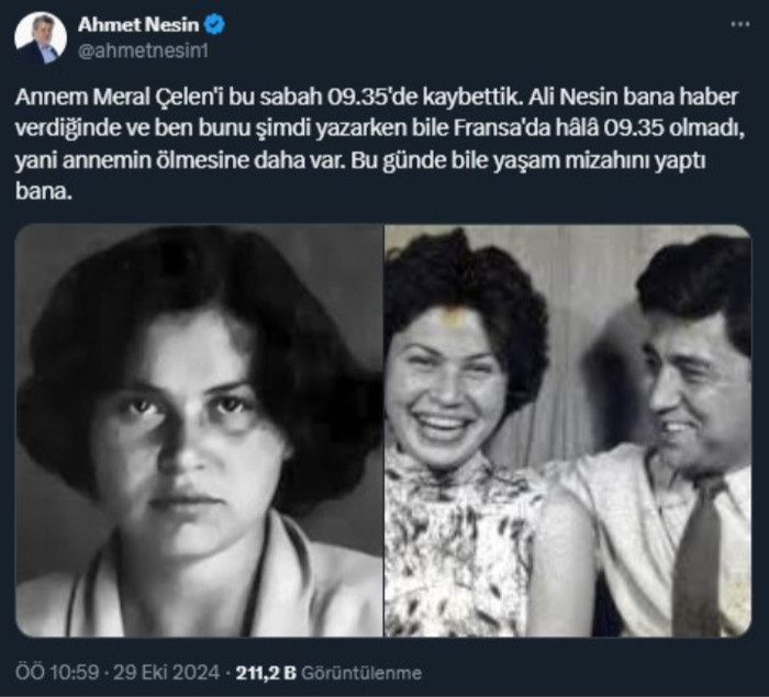 • Şu gün - 29-njy oktýabrda meşhur satiriki ýazyjy Eziz Nesiniñ aýaly, ýazyjy Meral Çelen aradan çykdy. Merhuma iman baýlygyny dileýäris. Dünýä belli satiriki ýazyjy, şol sanda türkmen okyjylarynyñ arasynda hem giñden tanalýan Eziz Nesiniñ aýaly, "Nesin" fondunyñ esaslandyryjy Meral Çelen (1934-2024) şu gün aradan çykdy. 1973-nji ýylda Meral Çeleniñ teklibi bilen gurlan "Nesin" fondy howandarsyz we ýetim çagalara okatmagy we durmuşa goşulşyp gitmegi üpjün etdi. Meral daýzanyñ ýadawsyz tagallalary bilen fond düýpli jemgyýetçilik guramasyna öwrüldi. Žurnalist Ahmet Nesiniñem ejesi bolan Meral Çelen terjimeçilik we döredijilik işi bilenem ýakyndan tanalýardy. Ahmet Nesin ejesiniñ aradan çykandygyny şeýle sözler bilen habar berdi: "Ejem Meral Çelenden şu gün irden 09:35-de jyda düşdük. Doganym Ali Nesin muny maña habar berende we men muny ýazyp durkam-da Fransiýada 09:35 bolmandy, ýafny ejemiñ ölmegine entek wagt bar. Şular ýaly günde-de durmuş meniñ bilen henek atyşýardy". ![]() | |
