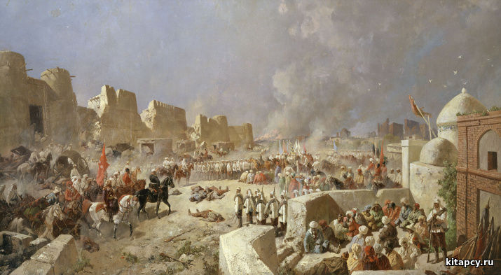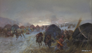 Николай Каразин. Сибирские казаки исследуют новые земли. Фото: wikipedia.org Он получил золотую саблю с надписью "За храбрость" в сражении на Зерабулагских высотах в Туркестане, был художником-корреспондентом в Сербско-турецкую и Русско-турецкую войну, участвовал в научной экспедиции по поручению Русского географического общества, написал цикл картин в честь открытия Закаскпийской железной дороги, получил награды на географических выставках в Лондоне и Париже. "Каразинский стиль" в конце XIX – начале ХХ века узнавали не только искусствоведы, но и широкая публика. Увы, после революции его надолго забыли. • С кистью и саблей Изначально Николай Каразин планировал сделать военную карьеру. Он закончил 2-й Московский кадетский корпус, поступил в Казанский драгунский полк и участвовал в усмирении Польского мятежа 1863-64 годов, где получил свою первую награду: орден Святой Анны 4-й степени с надписью "За храбрость". Но в 1865 году молодой офицер решил подать в отставку, чтобы профессионально заняться живописью. Он поступил в Академию художеств, где обучался под руководством известного баталиста Богдана Виллевальде. Через два года начинающий живописец был вынужден покинуть Академию. "На их курсе была задана тема из Библии: "Посещение Авраама тремя ангелами". Каразин трактовал её реально: нарисовал палатку, трёх странников, сидящих у стола, Сарру прислуживающую и Авраама, беседующего с ними. За такую трактовку темы он получил от жюри следующее замечание, написанное на самом рисунке (он уже издали увидел эту надпись, проходя по выставке к своему рисунку): "Отчего Вы лишили ангелов подобающего им украшения – крыльев?", Каразин немедленно схватил карандаш и написал: "Потому что считал Авраама догадливее академиков и что если бы он увидел ангелов с крыльями, то тотчас же догадался бы, кто они такие". За что и был немедленно в 24 часа исключён из академии. Маленький набросок этой картины долго у нас сохранялся…" Из воспоминаний художницы Александры Шнейдер Николай Каразин. Зачисление в казаки пленных поляков армии Наполеона, 1813 г. Фото: wikipedia.org Николай Каразин вернулся в армию и в 1867 году отправился в Туркестан. Позже он признавался в воспоминаниях: "Этот совершенно неизвестный тогда мир и его изучение было постоянной моей мечтой, и вот эта мечта осуществилась". Командуя ротой 5-го Туркестанского линейного батальона, Каразин отличился во многих битвах: при аулах Ухум и Хаят, при штурме Чапан-атинских высот под Самаркандом, под Ургутом и при Кара-Тюбе. Когда генерал Александр Абрамов поручил ему задержать основные силы бухарцев на Зерабулакских высотах, он уже был штабс-капитаном и руководил полубатальоном. В рукопашной схватке у него сломалась сабля и после сражения, увидевший у него в руках лишь эфес генерал Константин фон Кауфман, сказал: "Вы испортили своё оружие; хорошо, я пришлю вам другое". На следующий же день Каразин получил золотую саблю с надписью "За храбрость". Николай Каразин. Фото: wikipedia.org В том походе художник познакомился со своим коллегой, Василием Верещагиным, который тоже принимал участие в сражениях и писал картины. "Верещагин сражался с такой храбростью, с таким презрением к смерти, что возбуждал удивление и восхищение даже в старых вояках. В каком-то фантастическом костюме из когда-то белого холста, в широкополой поярковой шляпе, на ман