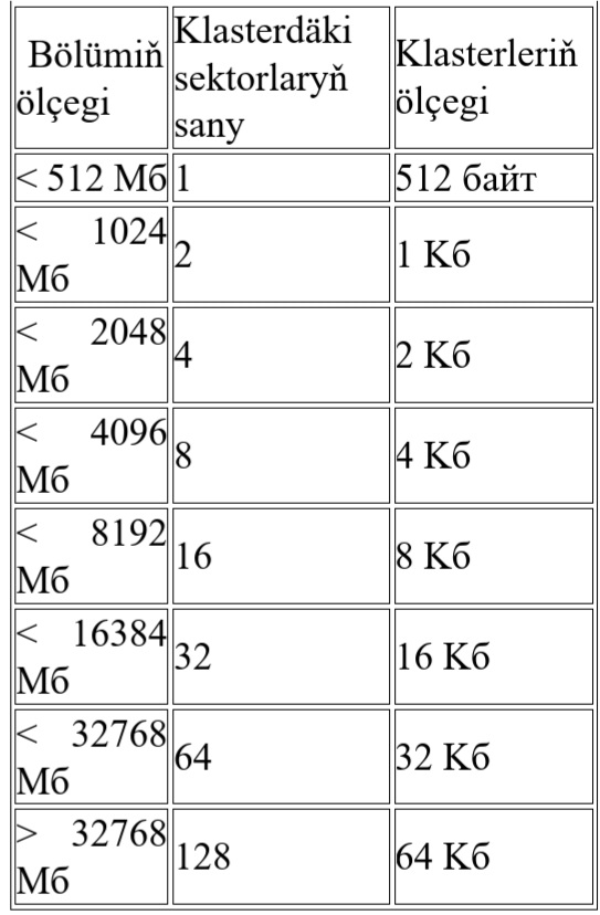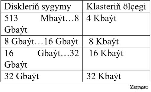 Sistema blogy – bu blokda içki gurluşlar saklanýar. Monitor – informasiýalary tekst ýa-da grafiki görnüşde bermek üçin ulanylýar. Klawiatura – simwollary, buýruklary girizmek üçin hyzmat edýär. Syçan (manipulýator) – buýruklary (komandalary) girizmek üçin ulanylýar. Goşmaça daşky gurluşa perferiýa enjamy diýilýär (mysal üçin:printer, skaner). Kompýuteriň operatiw (işjeň, çalt) ýady. OÝ – bu berlenleri saklamak üçin iň çalt täsirli gurluşdyr. OÝ berlenler işlenýän wagtynda olary gysga möhletleýin saklamak üçin peýdalanylýar. Magnit diskler. Magnit diskler – berlenleri uzak möhletleýin saklamak üçin ulanylýar. Çeýe magnit diskleri (disketler) – kiçi möçberli berlenleri bir kompýuterden beýleki kompýutere geçirmek üçin ulanylýar (häzirki döwürde olar ulanyşdan galdy). Gaty diskler – uly möçberdäki berlenleri saklamak üçin peýdalanylýar. Ykjam (Lazer) diskler – uly möçberli berlenleri geçirmek we olary okamak üçin ýörite gurluşlardyr. Ilkinji ykjam diskler okamak üçin niýetlenipdir. Geçen asyryň 80-nji ýyllarynda göwrümi 650 Mbaýtdan 700 Mbaýta çenli ykjam diskler ulanylypdyr. Ulanyjylarda öý şertlerinde diske ýazmak zerurlyklarynyň ýüze çykmagy, CD-R (Compact Disc-Recordable) tehnologiýasynyň döremegine getirýär. Ýöne CD-R disklere bir gezek ýazmak mümkinçiligi bolupdyr. Bu ýagdaý CD-RW (Compact Disc-Rewritable) diskleriň çykmagyna getirýär. CD-R disklerden tapawutlylykda, bu disklere birnäçe gezek ýazgy edip bolýar. Ykjam diskleriň DVD (Digital Versatile Disc) görnüşi 1997-nji ýylda köpçülige ýetirilýär. DVD we CD ykjam diskleriň arasynda uly tapawut ýokdur. DVD diskleriň CD disklere garanyňda ýazylyş dykyzlygy uludyr. Adaty ýagdaýda DVD diskleriň göwrümi 4,7 Gbaýta deňdir. DVD-R diskleriň göwrümi CD-R diskleriň göwrüminden takmynan 6,7 esse uludyr. Şeýlelikde, 1997-nji ýylda DVD-R (W) diskler hem ulanylyp başlanýar. DVD disklerden soň has kämilleşen HD-DVD we Blu-ray görnüşler, şeýle hem fleş-ýatda saklaýjy gurluşlar ýüze çykýar. Formatlaşdyrmak. Disk formatlaşdyrylanda ýodajyklara, ýodajyklar bolsa sektorlara bölünýärler. Her bir sektoryň sygymy 512 baýta (0,5 Kbaýta) deňdir. Gaty disk birnäçe magnit disklerinden ybaratdyr. Ilkinji ýodajyk (nolunjy) magnit diskinde hyzmatçy ýodajyk hasaplanýar, ol özünde hyzmatçy informasiýalary saklaýar. Bu ýodajykdaky tablisa FAT (File Allocation Table — faýllary ýerleşdirme tablisasy) diýilýär. Bu tablisada faýllaryň salgylary ýerleşdirilýär. Eger-de bize haýsy bolsa-da bir faýl gerek bolsa, onda kompýuter onuň ady boýunça tablisadan faýlyň ýerleşýän ýodajygynyň we sektorynyň belgisini (nomerini) tapýar. Şondan soň, magnit kellejik gerekli orna geçip faýly okaýar we ol operatiw ýada işlemek üçin iberilýär. Gaty diskde faýllaryň ýerleşdirilişi. Her bir faýlyň öz salgysy bolýar. Bu salgy faýllary ýerleşdiriji tablisada iki baýtlyk san bilen ýazylandyr, ýagny bu salgyny ýazmak üçin, 16 bit göz öňünde tutulandyr. 16 bitiň ( FAT 16) kömegi bilen 216 (65536) dürli bahany aňlatmak bolýar. Diýmek, faýllara gaty diskde 65536 dürli salgydan köp göz öňünde tutulan däldir (faýllar 65536 –dan köp däldir). Eger-de diskiň ölçegi 2 Gbaýt bolsa, onda her salga: 2 Gbaýt/ 65536=32 Kbaýt ( 2*230/216 =215 =32Kbaýt ) informasiýa ýeter. Her bir faýlyň ýeke täk hususy salgysy bolmalydyr. Klaster – diskde salgy üçin niýetlenen ýeriň iň kiçi ölçegidir, ol faýl sistemasy tarapyndan bir faýl üçin bölünip berilýär. Winçestr formatlaşdyrylanda aşakdaky tablisa laýyklyda awtomatiki döredilýär. Bölümiň ölçegi Klasterdäki sektorlaryň sany. Klasterleriň ölçegi: Biz 2 Gb ölçegli gaty disk üçin, klasteriň ölçeginiň 32 Kbaýta deňdigini gördük. FAT 32 – bu sistemada salgy dört baýtlyk (32 bit) san bilen ýazylýar. Şeýlelikde, salgylar has köpelip, aýratyn klasterleriň ölçegleri kiçeler we peýdasyz ýitgiler azalar. Bir klasterde onlarça sektorlar saklanyp bilýär, faýl nähili kiçi bolsa-da, ol bütin bir klasteri eýeleýär we peýdalanylmaýan sektorlar boşlugyna galýar (ýitýär). FAT 32 üçin klasterleriň ölçegi: FAT tablisadan başga-da NTFS (New Technology File System – täze tehnologik faýl sistemasy) tehnologik faýl sistemasy bardyr. Fiziki we logiki diskler. Adaty gaty disk – bu fiziki gurluşdyr. Gaty diskde ýer ýitgisini azaltmak üçin, ony bölümlere bölýärler. Netijede klasterleriň ölçegleri üçin ýitgiler azalýar. Şeýle bölümleriň her birine aýratyn logiki disk hökmünde seretmek bolar. Her bir logiki diskiň faýllary ýerleşdiriş hususy tablisasy bolýar. Diskiň ady bir iňlis harpyndan we iki nokatdan durýar. Mysal üçin: C: 1-nji gaty disk. D:, E:, … harplar bilen indiki diskler bellenýär. Lazer diskleri okamak üçin, ýörite disk hereketlendirijiler (CD-ROM gurluş) ulanylýar. Faýlyň salgysy, katalog. Faýllar bilen işlemek amatly bolar ýaly diskde kataloglar döredilýär. Katalog – bu faýllaryň atlaryny, häsiýetlerini, olaryň ölçegleri baradaky maglumatlary, we ş. m. saklamak üçin diskde ýörite ýer. Eger bir katalogyň içinde beýleki katalog ýerleşse onda olaryň atlary “\” (çepe ýapgyt çyzyk) bilen bölünýär. Mysal üçin. C:\Meniň dokumentlerim \Makalalarym\Faýlyň ady – bu yzygiderlik faýlyň adyna eltýän ýol ýa-da faýly gözlemek üçin ýol diýlip atlandyrylýar. Berlenler kompýuterde prosessoryň kömegi bilen işlenýär. Merkezi prosessor (CPU – Central Processing Unit) – kompýuteriň esasy gurluşy, ol programma arkaly berlen arifmetiki we logiki amallary ýerine ýetirýär hem-de kompýuteri dolandyrmagy üpjün edýär, oňa "Kompýuteriň beýnisi” hem diýilýär. Prosessor operati